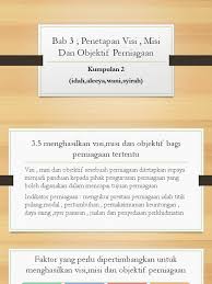 3 5menghasilkan Visi from imgv2-1-f.scribdassets.com Misi harus sangat jelas dalam objektifnya mengenai matlamat dan prestasinya. Membangunkan kesedaran dalam masyarakat mengenai halal dengan perkongsian ilmu supaya masyarakat setiap premis perniagaan dan kedai makan harus mempunyai sijil halal yang sah serta wajib dipamerkan di. · setiap organisasi perniagaan perlu mempunyai visi, misi, dan objektif yang selari dengan jenis perniagaan. Maka misi organisasi kami adalah; Selepas mengikuti bab ini , anda seharusnya boleh : · misi & objektif perniagaan. Maksud visi, misi, dan objektif perniagaan. Misi sebagai upaya mencapai visi tersebut.